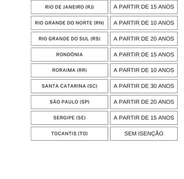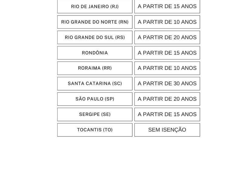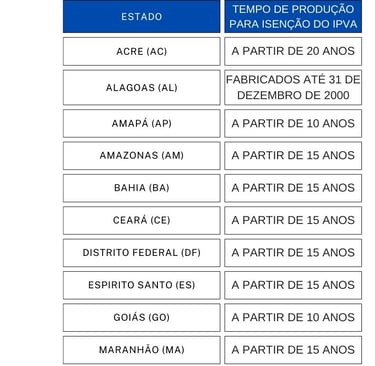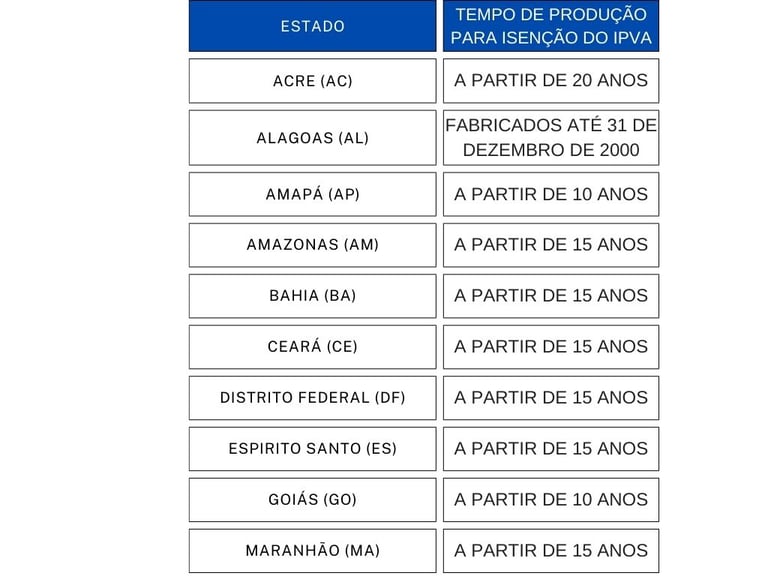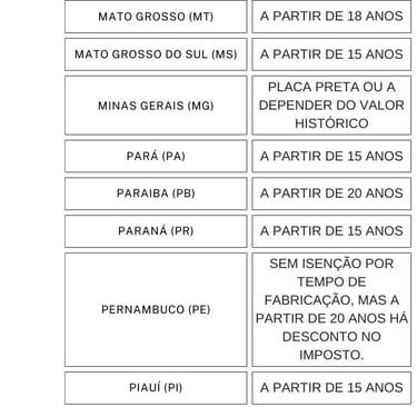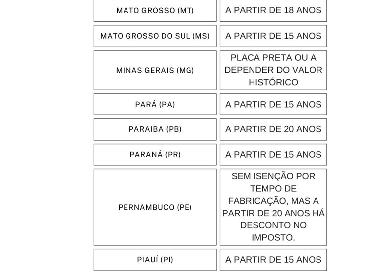 Dentre essas situações, a mais comum é o tempo de fabricação do veículo, cujo período varia entre cada um dos estados da federação, conforme tabela abaixo, preparada pela Doutora Anali C. C. Sanches Menna Barreto: